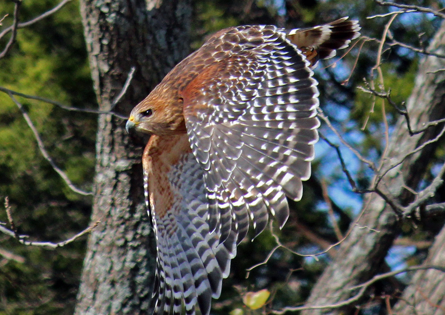 | Red Shouldered Hawk taking flight from a pecan in the Renda meadow below Scyene Overlook |
