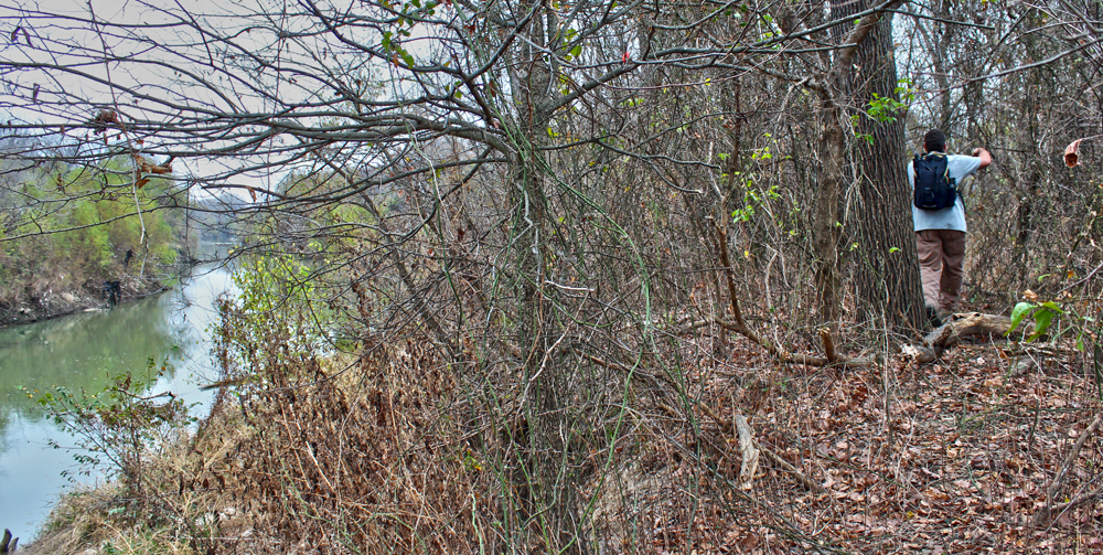 The trail constricts as it approaches the Buckeye Grove. Surrounded by several acres of thick Chinese Privet the Buckeyes might be hard to spot this time of year unless one knows what to look for. The Buckeyes annually bloom in the middle of March and are often some of the first spring flowers on the Trinity. A must see.