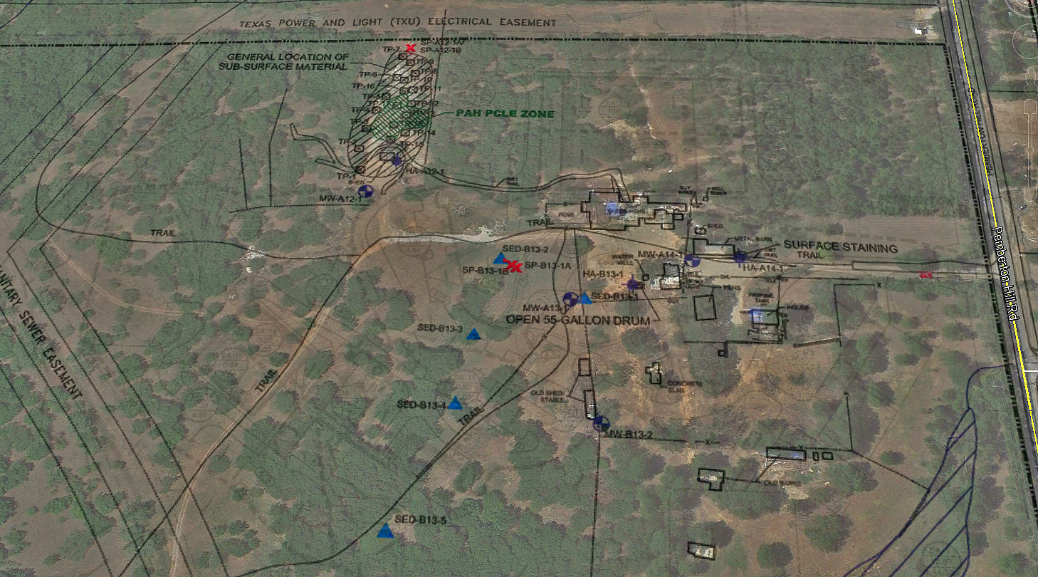 In red are areas of interest that are hard to spot on the Terracon Maps or are unlabeled. Of note is the Polynuclear Aromatic Hydrocarbons (PAH PCLE Contamination Zone), see below. Polynuclear Aromatic Hydrocarbons are cancer causing substances that can be a root host of environmental damage and illnesses in humans.