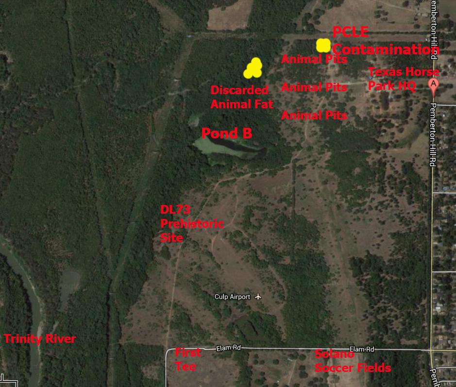 In order to make heads and tails of most of it I have amended a few maps to show locations of importance to many reading this in three sections. The north section that focuses on Big Spring and the future Texas Horse Park. A central section that has focuses on contaminated ponds and seeps that flow directly into the Trinity River. The last but not least is the south section with the vital bird ponds that are so important to the Trinity River Audubon Center.
