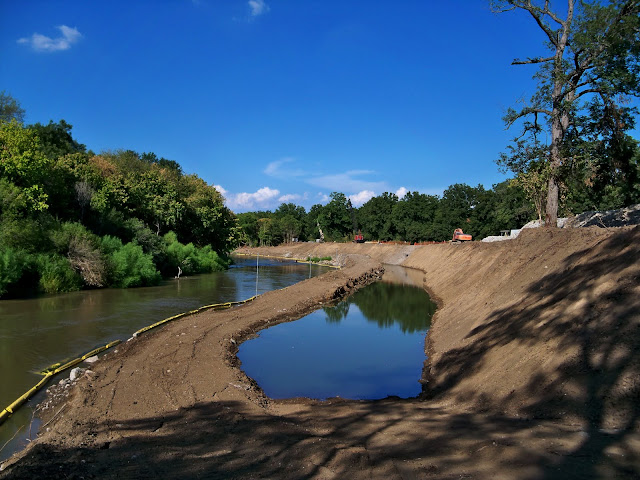 As you can see, heavy construction is underway on about 1/4 mile of the south riverbank. A cofferdam holds back the river for construction of piers to support a future rock wall.