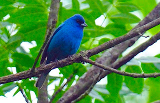 The Indigo Bunting (Passerina cyanea) Bill and Scott heard the call of this bird from afar and identified it as a bunting but we never saw it. I blindly aimed at the far tree it was calling from and hoped it would appear in a photo. Sure enough it did. They guessed Painted Bunting, in this case it was an Indigo Bunting.