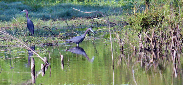 There is post-breeding dispersal to well north of the nesting range, as far as the border between the US and Canada. The particular Little Blue Herons pictured here are at Honey Springs near Joppa. The hibiscus plant to the right is a bit of an oddity and something I have never noticed before. My guess is that it was planted when this area was part of the Sleepy Hollow Country Club.