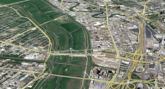 Near Reunion Tower and the old Reunion Arena site, the old river channel ran down what is now Riverfront Blvd. The channel ran through the widest span of the Houston Street Viaduct which now sits almost 1/2 of a mile from the present channel. The old channel ran through the present Fuel City Truck Stop/Tacorama then past the Old Sportatorium site on the east side of I-35.