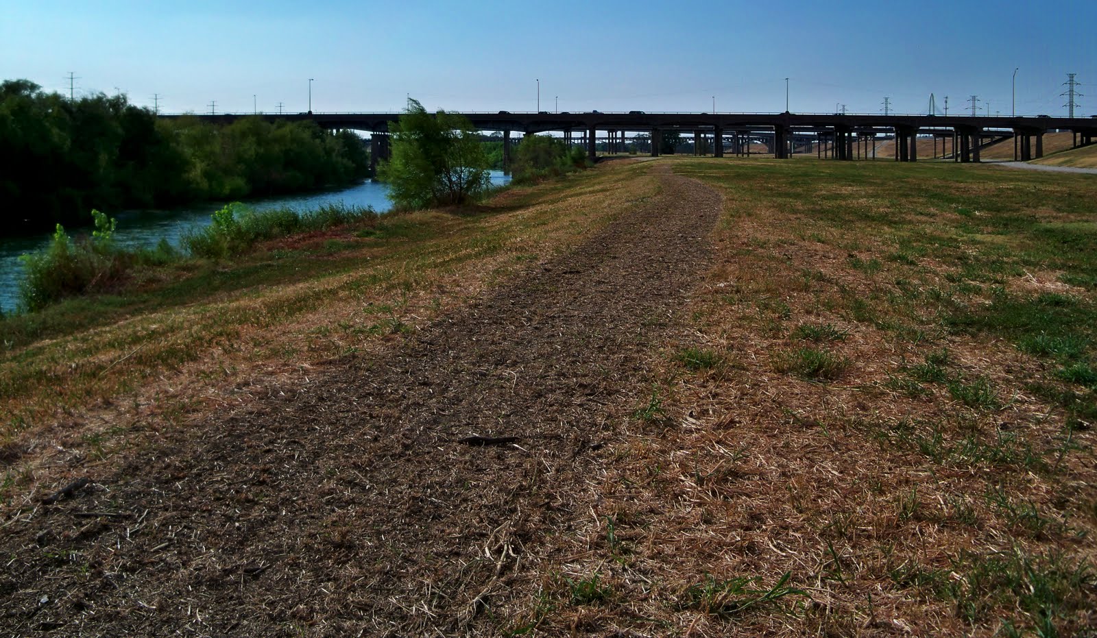 Once in a great while, someone wants to change that. Almost exactly a year ago City Council members Angela Hunt and Scott Griggs launched a grass roots, low key initiative to put a soft surface trail in between the levees. More of a proof of concept idea turned reality, the trail meandered from Crow Park at Sylvan Avenue to I-35. It was a trail scalped out of the grass, leveled in spots and easy to ride by bike or horse. With the heavy fall rains and flooding I think that idea was put out to pasture, so to speak. The trail was complete though.