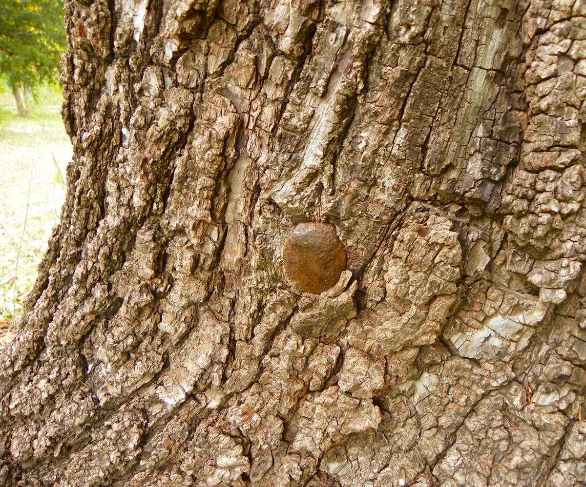 | Walnut Tree at the spring with a spike driven in it noting the highwater mark of the 1908 flood |