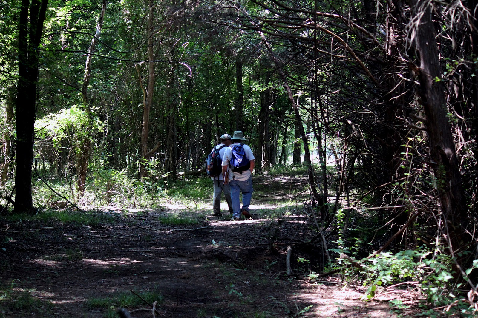| Bill and Tim walking down a cedar break canopied ranch road in the Great Trinity Forest |