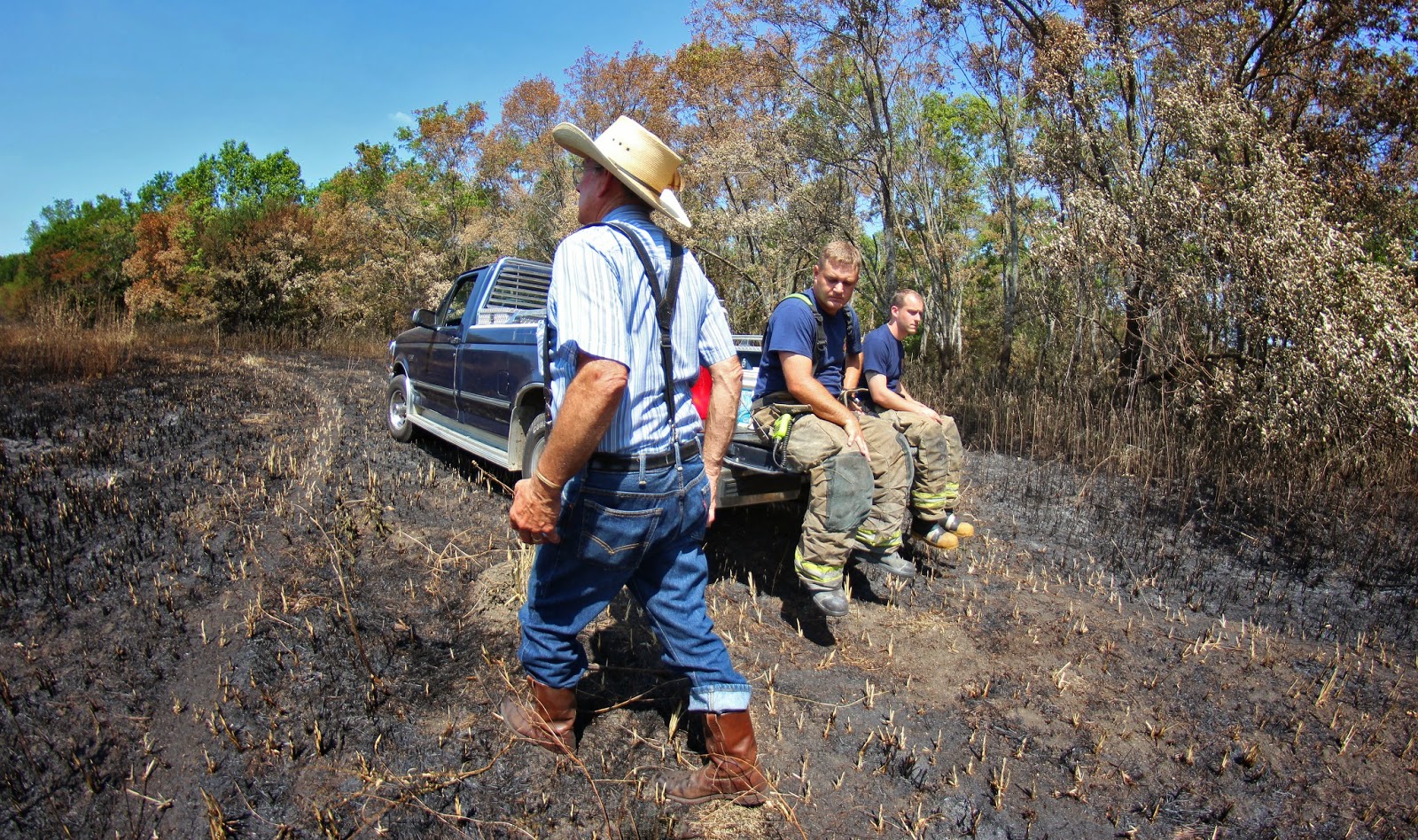 | Billy Ray Pemberton with two firefighters, a pile of buckets, shovels and rakes in his pickup, Big Spring, July 25, 2014 |